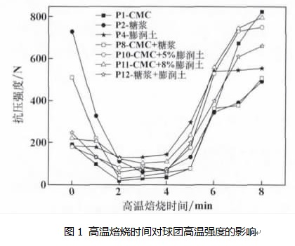 3) 不同粘結(jié)劑的球團干球抗壓強度相差較大,但在高溫焙燒時強度變化趨勢基本一致,在焙燒初期 02 min 時球團抗壓強度快速降低, 4 8 min 時球團強度逐漸提高。