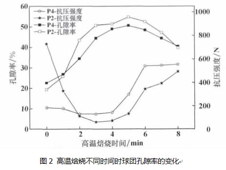 如圖2所示,含碳球團的孔隙率隨焙燒時間延長先升高后降低,結(jié)合對氧化球團還原過程強度的變化研究 ,含碳球團焙燒初期強度的急速降低是由球團內(nèi)部孔隙率的增大引起的。