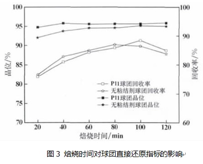 確定球團 P11 為配方后,對其進行直接還原焙燒-磁選試驗。無粘結(jié)劑球團作為對照試驗,考察粘結(jié)劑對球團直接還原焙燒磁選的影響。從圖3 可以看出,兩種球團隨焙燒時間的變化趨勢基本一致,隨著焙燒時間的延長,直接還原鐵產(chǎn)品品位變化不大;回收率呈先升高后緩慢降低的趨勢。