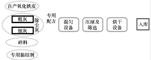 降低壓球含水量,提高壓球強(qiáng)度。黏結(jié)劑中可含部分增加冷固球團(tuán)強(qiáng)度、阻止黏結(jié)劑氧化且對鋼水成分不造成影響的無機(jī)物。工藝路線圖如下: