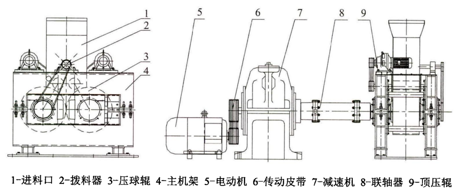 壓球機是生產(chǎn)線的關(guān)鍵設(shè)備,其主體結(jié)構(gòu)是一對相向轉(zhuǎn)動的壓輥,其中一個壓輥是固定安裝的,另一個壓輥為活動輥,通過液壓系統(tǒng)支撐在機架上,壓輥的表面有定制的模具,當物料定量連續(xù)進入或通過預(yù)壓機強制進入壓輥中間時,物料就被壓縮成型。